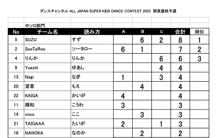5部門までしか得点表がアップできませんので中学生ソロ部門の得点表は こちら とご確認ください