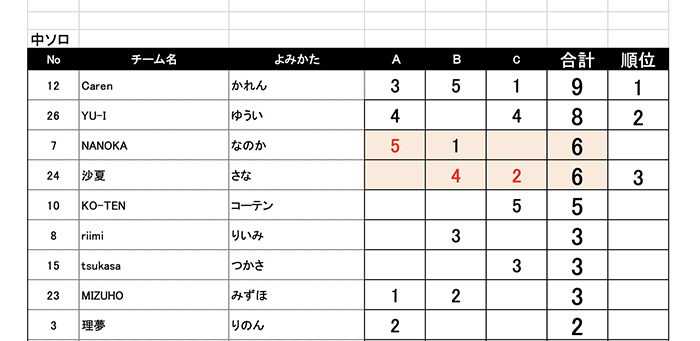 5部門までしか得点表がアップできませんので中学生ソロ部門の得点表は こちら でご確認ください。