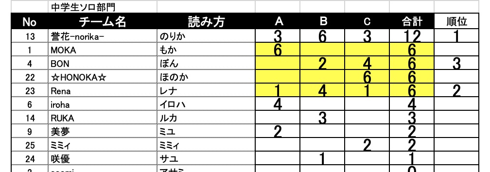 サイトのシステム上5部門までしか得点表が公開出来ませんので「中学生ソロ部門」は こちら をクリック